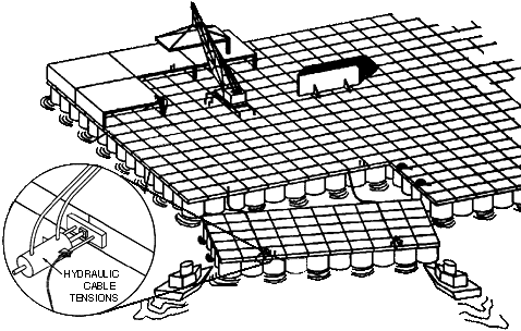 Developed by Float Inc. in the early 1990s, the PSP is a quite simple structure with impressive capabilities. A PSP consists of an array of open-bottom cells like a cluster of overturned drinking glasses with a flat deck built on top. These cells are rigidly connected and linked by air ducts at the top communicating air pressure from one cell to another. As wave fronts pass into the cell array they compress the air in cells like a pneumatic cylinder, increasing the air pressure in the cell ahead of it. In this way the energy in the wave itself is used to attenuate that wave. The result is that a PSP will consume all waves of wavelength shorter than the cross-section profile of the platform. Thus the platform remains as level and stable as if it were standing on a rigid tower in the water, like many oil rigs use, and will function as a breakwater allowing direct docking of vessels on its leeward edges and the deployment of new platform modules from that side, allowing them to be manufactured on the platform. A very neat solution to the problem of platform stability and construction, but the PSP goes even further. It can extract some of that wave energy as electricity by placing small turbines inside the air ducts linking the cells. Thus the platform becomes its own source of power that can be used for its own active station-keeping using electric azimuth thrusters mounted on the platform edge or under some of its cells. (so their drive motors can be kept on-deck for each maintenance) This eliminates the need for anchor cables –which for structures in very deep water can easily become astronomical in cost and complexity. Indeed, the anchor cables for the original Aquarius colony design would have consumed the entire world’s output of Kevlar for years! Of course, if you eliminate the need for anchor cables with active station-keeping you retain the potential free mobility of the whole structure. Thus it becomes possible for the PSP-based structure to be moved anywhere –albeit slowly— and so a colony based on this can relocate as it grows. So many logistical problems solved with just one structural concept!